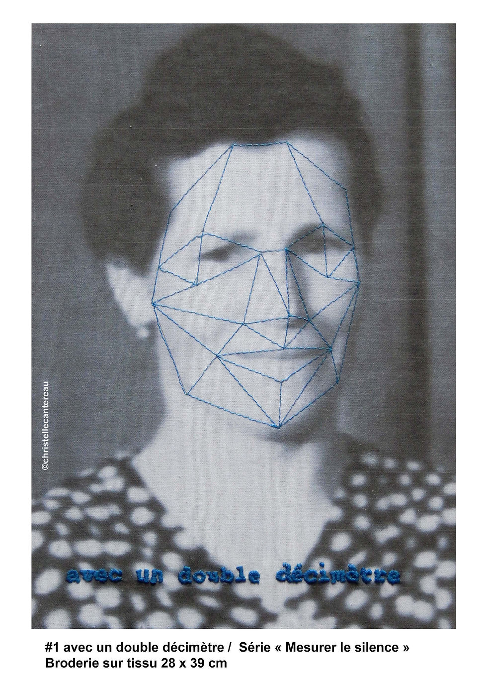 Les images imprimées sur coton sont parcourues de fil, évoquant un système de reconnaissance facial, ou du texte, besoin impérieux d’écrire en broderie ce silence devenu objet, d’une question qui restera sans réponse.
